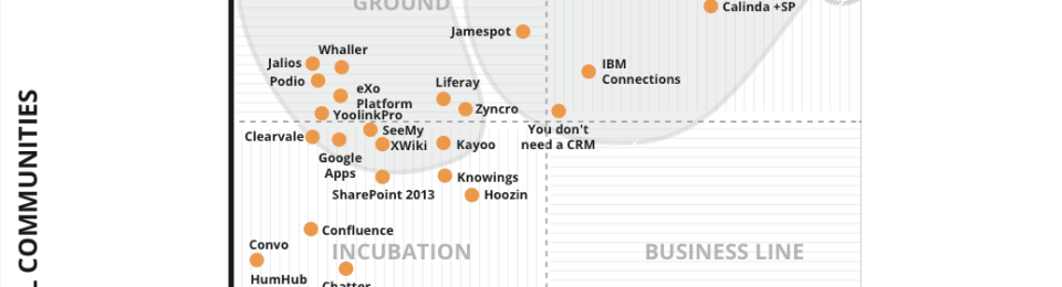 They indicate that most ESNs “are a long way behind social CRM specialists (Dimelo and Lithium)”. I’ve not watched Dimelo before (based in Paris & Munich) but it makes sense in catering to the French top 40 companies. Lithium frequently ranks as a winner in CRM Idol, the industry awards for this product category.